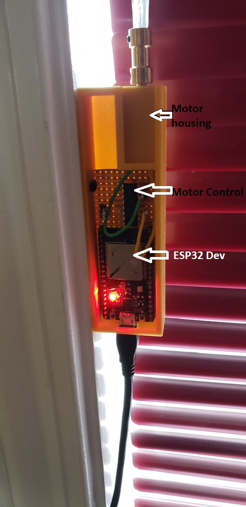 To begin with here is the orange box that contains all the electronics mounted on the casing of the window with a single screw.