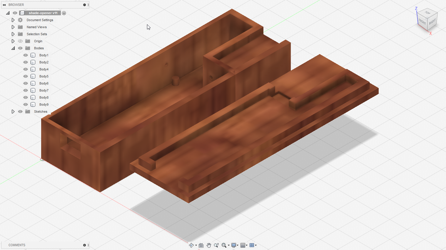 CaseThe case was done in Autocad's Fusion 360 and printed on a 3D printer. The case has a cavity that holds the motor tightly, shown in the upper right. The cavity was originally designed to hold the motor from turning but the fit is tight enough to allow the motor to sit inside without external mounting screws.There is a hole on the left side for a screw that attaches the case to the window casing. The lid is also shown. It has ribs that fit inside the walls of the bottom case. There currently isn't anything that fastens the top to the bottom case, although the ribs are long enough for a screw. Since there is little vibration when opening or closing, the lid doesn't work itself off. |